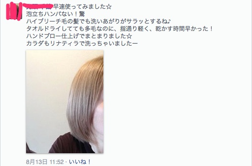 『早速使ってみました☆ 泡立ちハンパない!驚 ハイブリーチ毛の髪でも洗いあがりがサラッとするね♪ タオルドライしてても多毛なのに、指通り軽く、乾かす時間早かった! ハンドブロー仕上げでまとまりました☆ カラダもリナティラで洗っちゃいましたー』